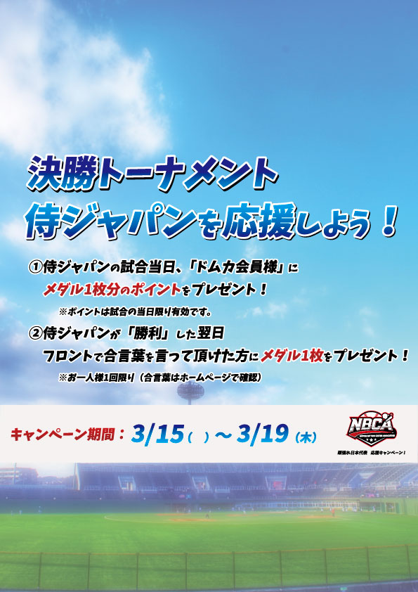 ➤➤①侍ジャパンの試合当日(15日)、『ドムカ会員様』にメダル1枚分のポイントをプレゼント!