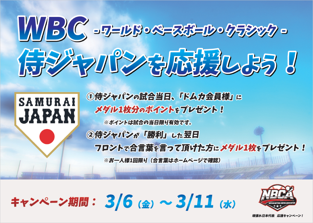 ➤➤①侍ジャパンの試合当日、『ドムカ会員様』にメダル1枚分のポイントをプレゼント!